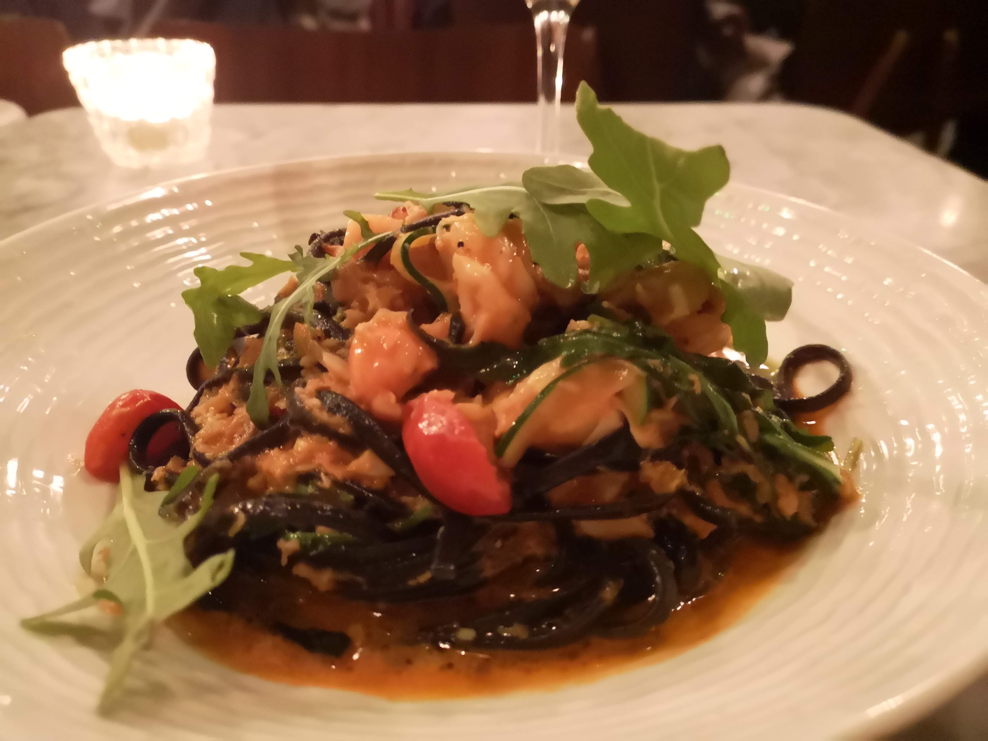 Previous Image Next Image My Soho Times | 40 Dean Street Black ink linguini with crab, prawns and courgette