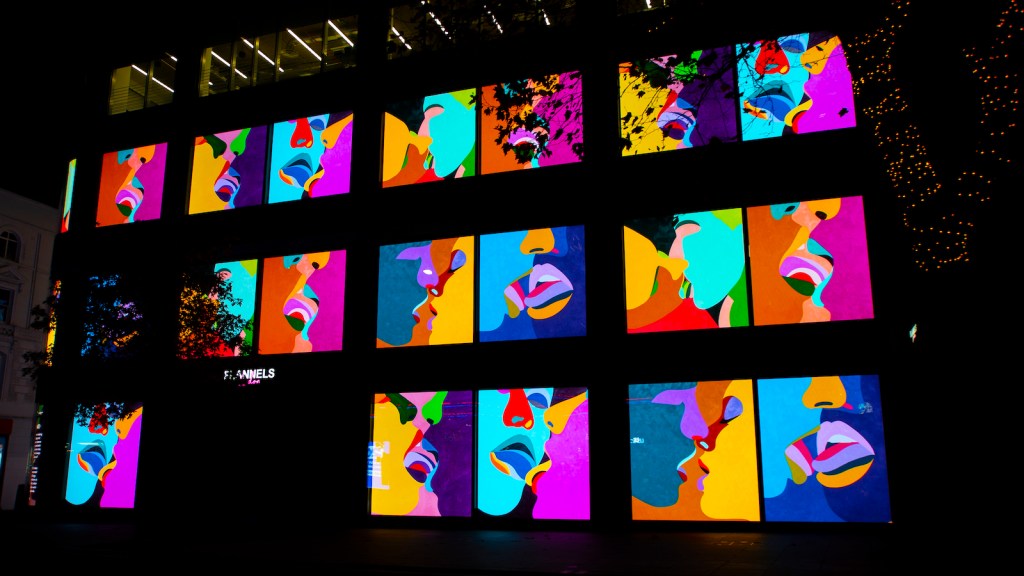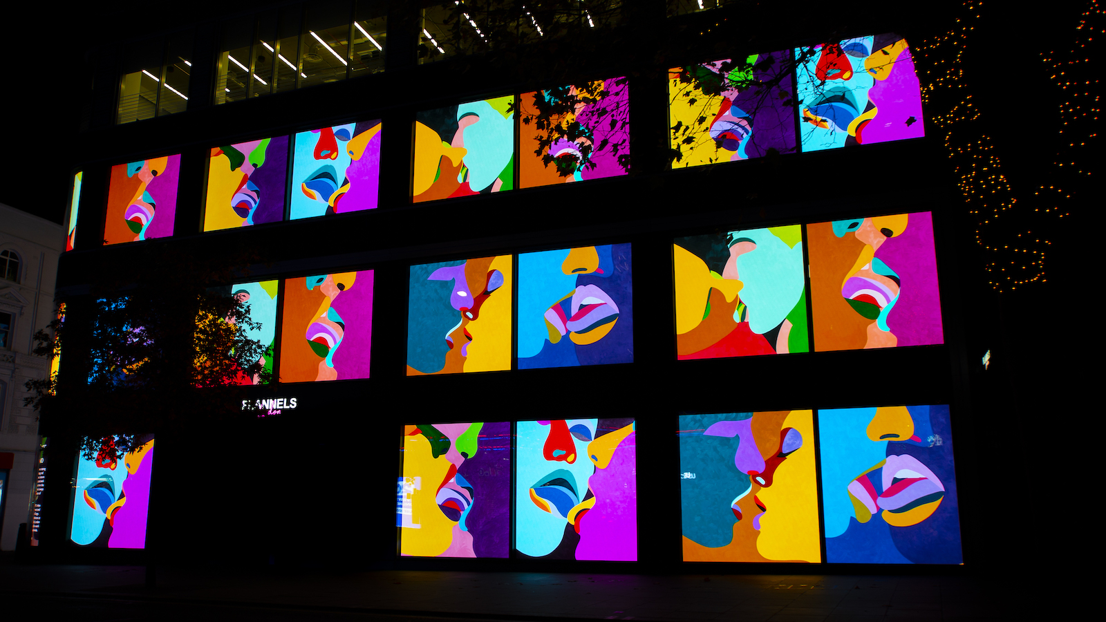 So far, so commercial. But it’s soon apparent it’s not just retail beaming out into winter gloom W1 Curates has transformed the exterior of the store into an extraordinary public exhibition space. Using state-of-the-art technology, they exhibit the best art with digital prowess and innovation. The aim is to make art available to everyone, all year round, night and day, via state-of-the-art tech. W1 Curates believes art has a purpose, the power to change the world. To drive consumer consciousness away from retail and towards issues that matter. As founder Mark Dale says, “For me, when shoppers rest their bags down and stare at the incredible art , it’s the best feeling in the world. Giving everyone the opportunity to experience art, to access it right there – amid all the noise of city life, it provides this little oasis. Shoppers and workers are left feeling ignited and inspired. We bring art to the people, we open those doors, and who knows where that could take them?”