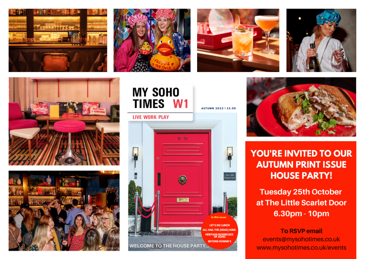 We’re excited to announce the Autumn issue of My Soho Times magazine is OUT NOW online, and available in print from the 25th October! Our front cover feature story is Little Door & Co‘s latest arrival – The Little Scarlet Door – bringing ‘the ultimate house party’ flat share concept to Greek Street… so, who’s ready for their exclusive invite?!