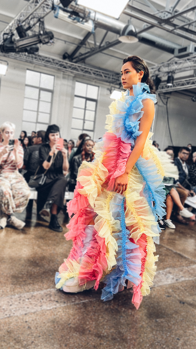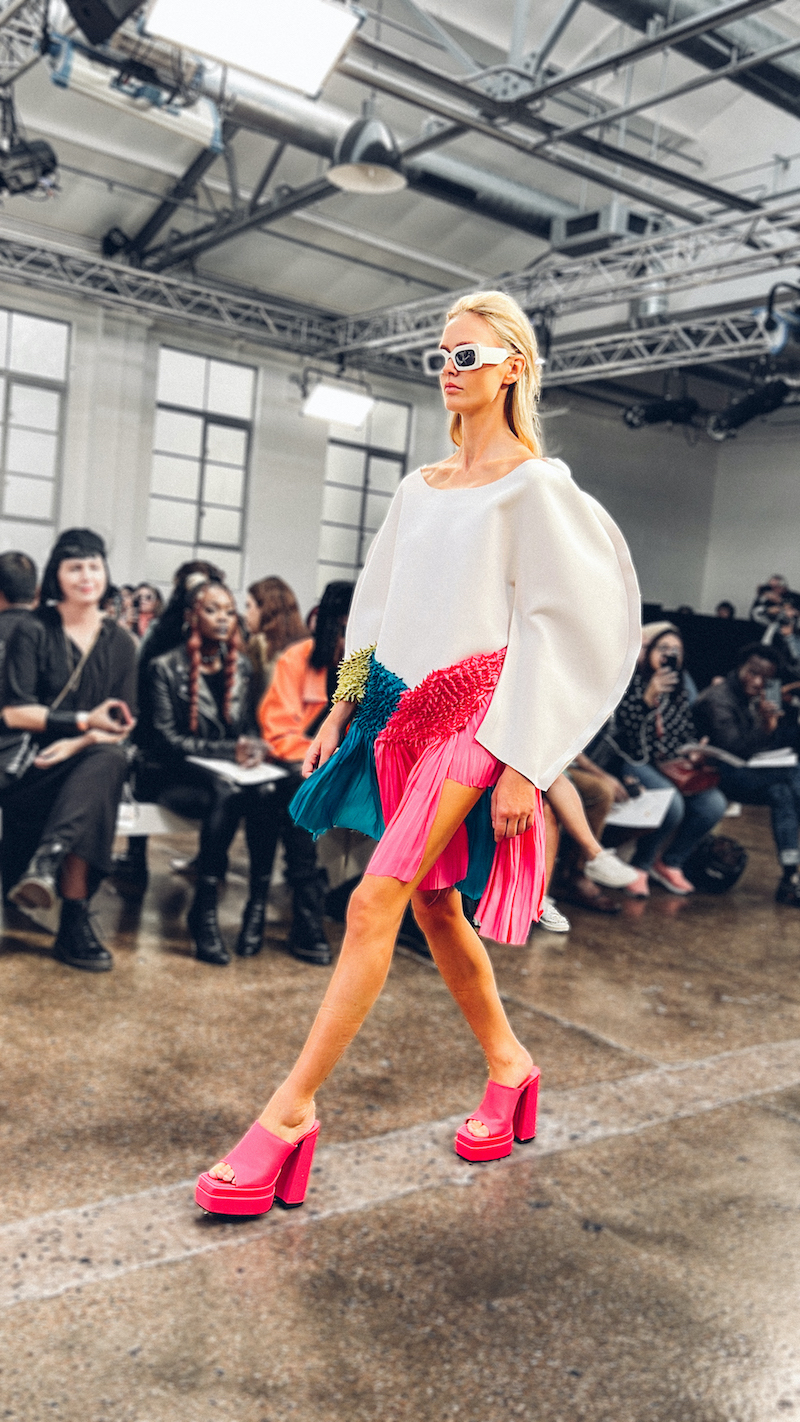 Created by Jun Nakamura in London in 2019, this burgeoning brand is determined to bring the Japanese technique of traditional Shibori to the western world. Because of this, JU-NNA has embraced eccentric and oversized silhouettes for their collection this year, along with fun, playful colour blocking. JU-NNA’s collection is another guarantee that we’ll see some striking colour coming into Spring, with gentle pastels intertwined with loud yellows and, again, this year’s favourite hot pink. This was my first time experiencing this brand on the runway, and I can’t wait to see what they come up with in the future. Definitely one to watch.