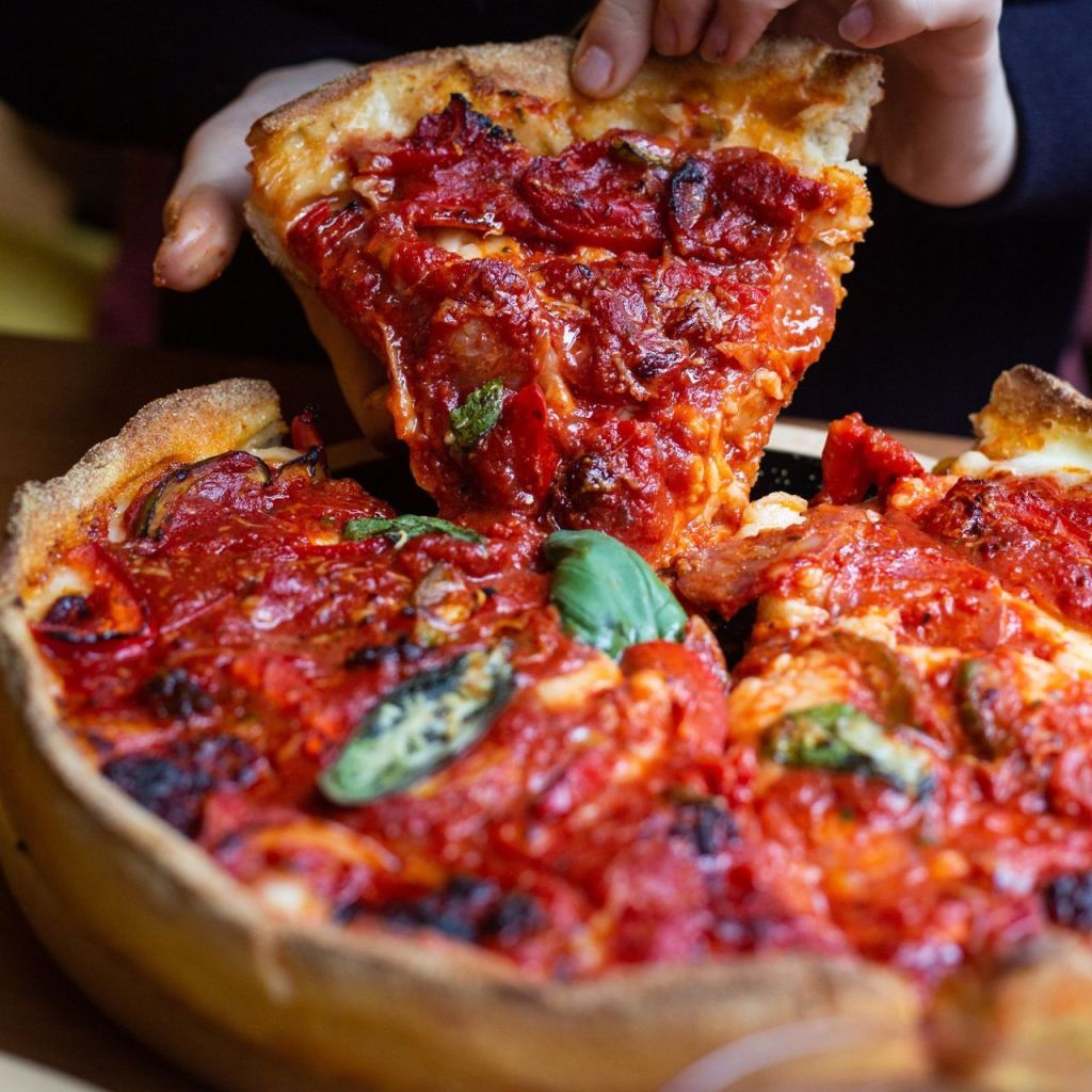 If you’re a cheese lover then this Chicago-style eatery is the place to go. Pick from a vegetarian Mediterranean pizza topped with goat cheese, feta, mozzarella and ricotta, with lots of veggies on top. There’s a wicked Chicken Tender deep pizza for poultry fans, or go for the ultimate in autumnal flavour with the Forest Truffle pizza. And get your phones ready, you’ll want an Instagramable moment of oozing stringing cheese as you cut a slice and target it towards your mouth!