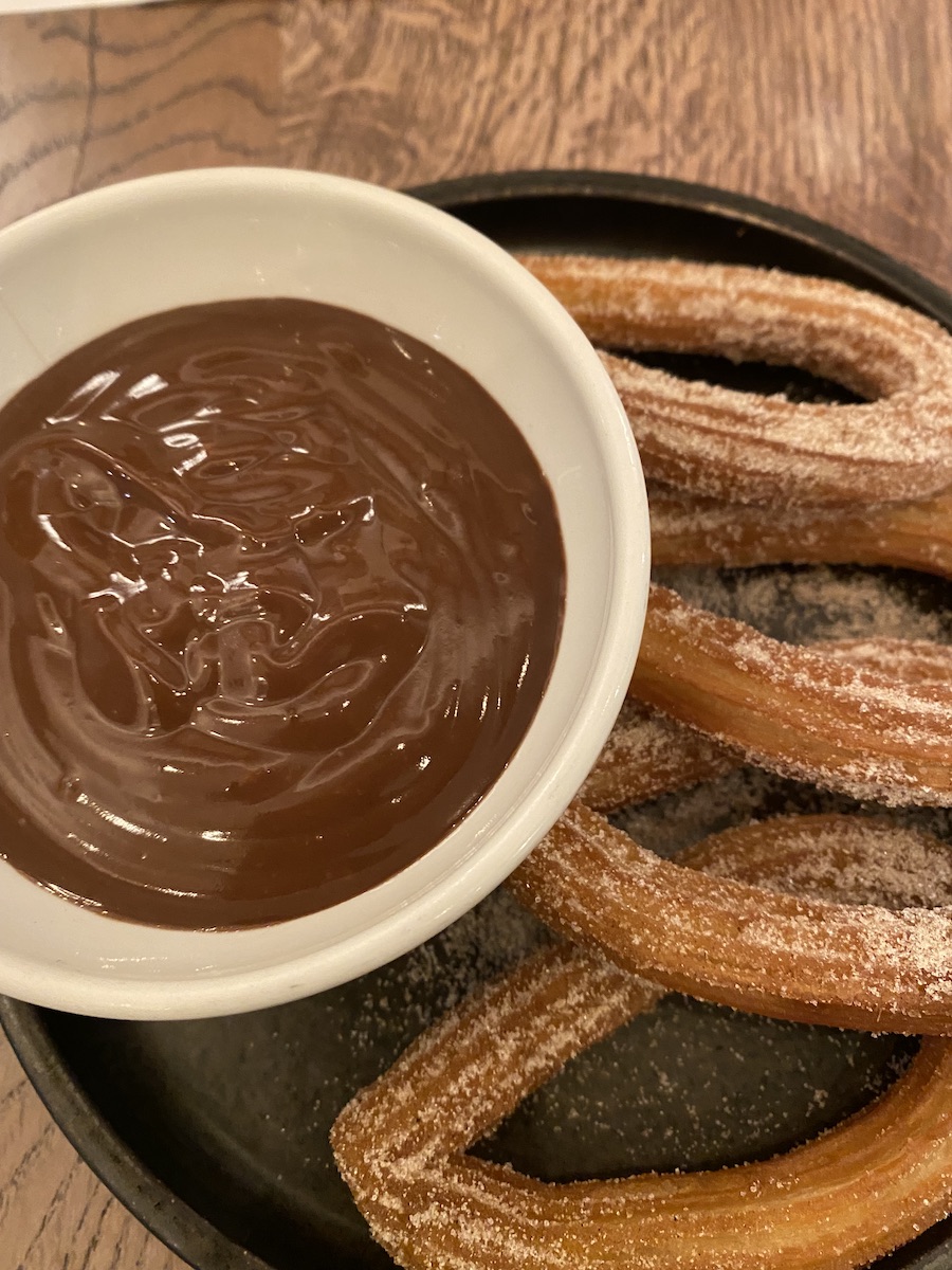 Pulpo A Feira (Galician octopus, potatoes, capers, paprika), Caballa Con Remolacha (mackerel, heritage beetroot salad, Unio muscatel vinegar, tarragon, ajillo), Churros Con Chocolate (classic Spanish sweet snack made from a choux pastry served with an indulgent warm chocolate sauce).