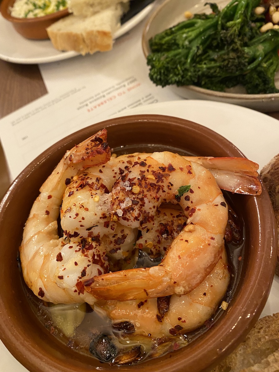 Gambas Al Ajillo (king prawns, chilli, garlic, olive oil, sourdough). The king prawns were big, juicy and cooked well. A well-balanced and hearty dish.