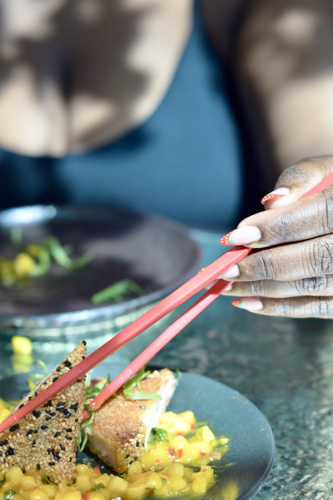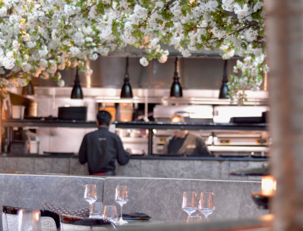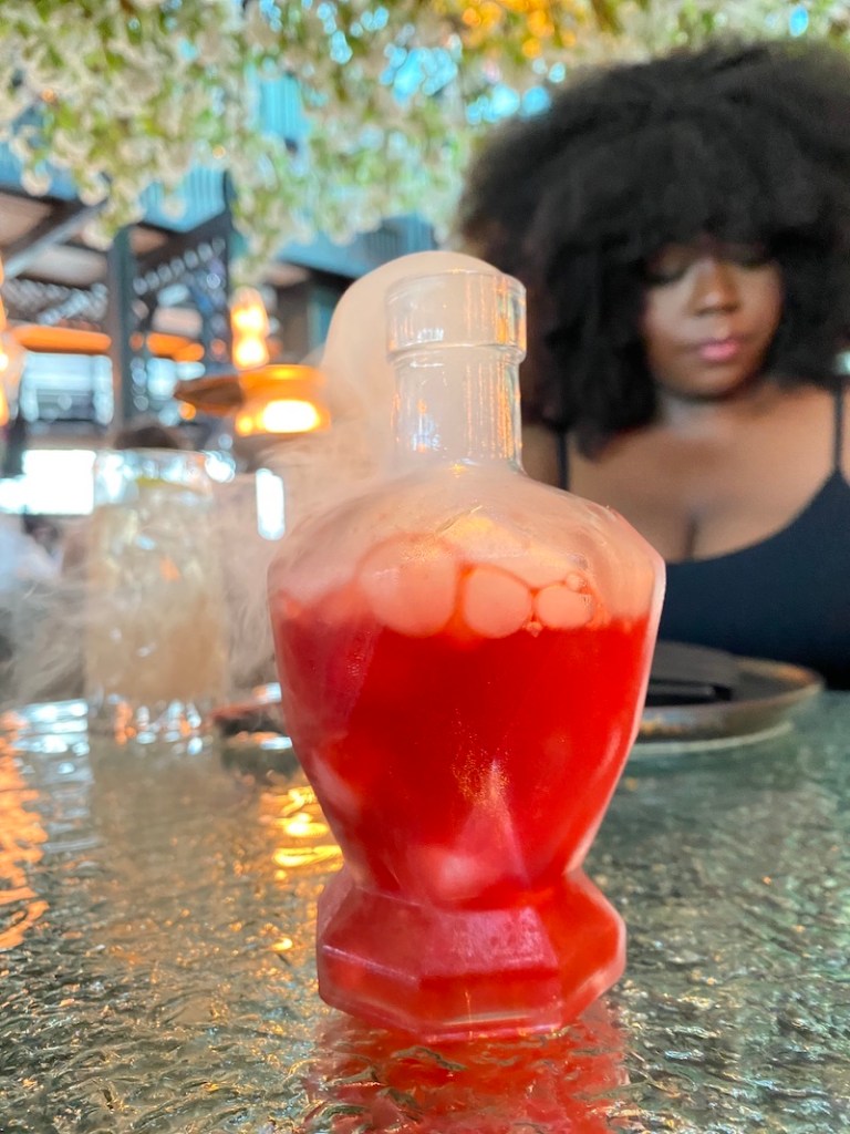 Soon after my arrival, Stephanie gracefully entered the premises, wearing a casual spaghetti strap black dress complemented by a white blouse. She exuded effortless charm. Her afro hairstyle gracefully framed her face, reflecting her bold self-assuredness and confidence. Our table was positioned under Tattu’s signature cherry blossom tree at the heart of the restaurant. I observed the sunlight filtering through the leaves, creating a playful dance of golden shadows on Stephanie’s face. I tried to capture this on camera as part of my reel, but of course, the image failed to convey the true beauty of the scene. It looked much better IRL (in real life) than on camera.