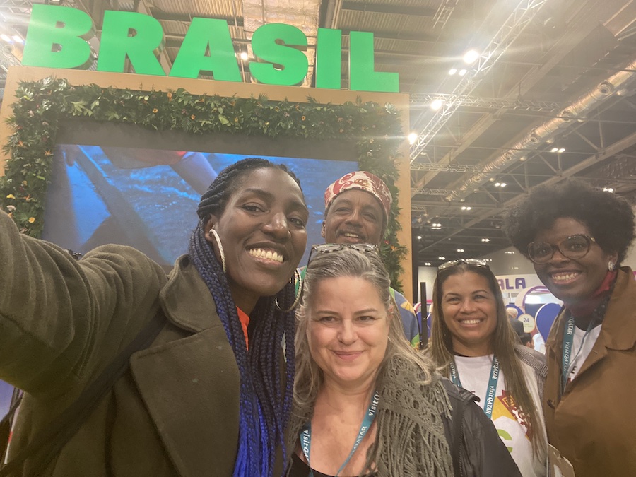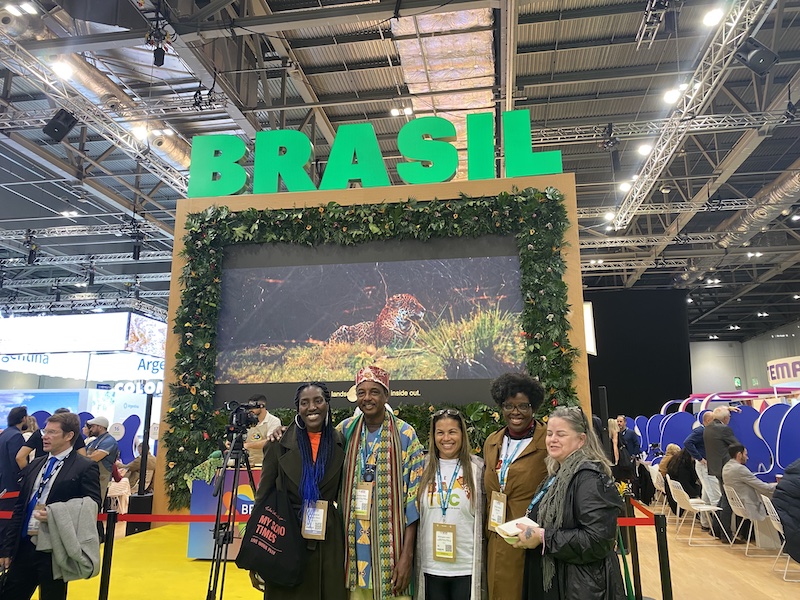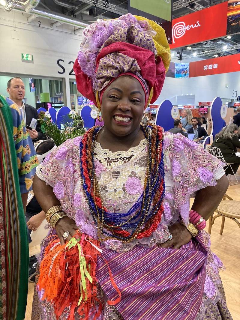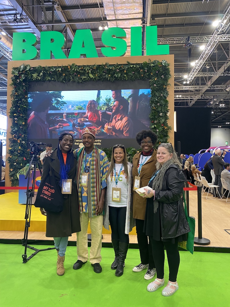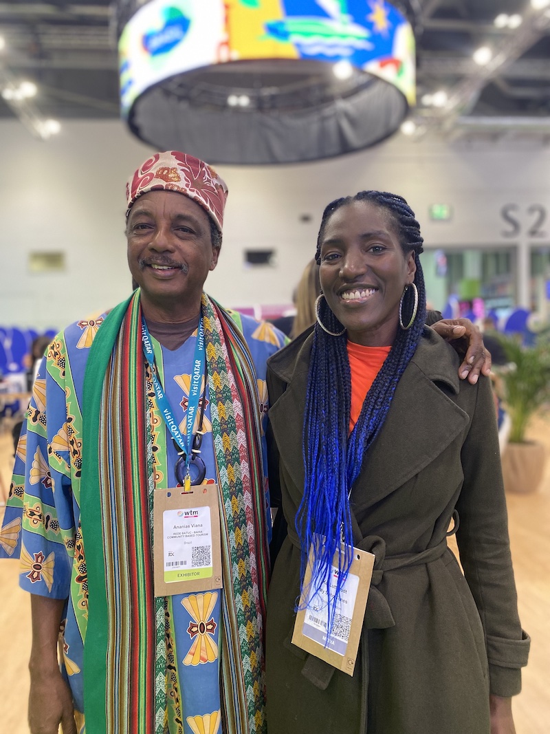 Photos: editor Kai Lutterodt at WTM, a Baiana (from the state of Bahia in Brazil) smiles warmly, Kai with community activist and heritage tourism leader Ananias Vivana, and Brazilian attendees.