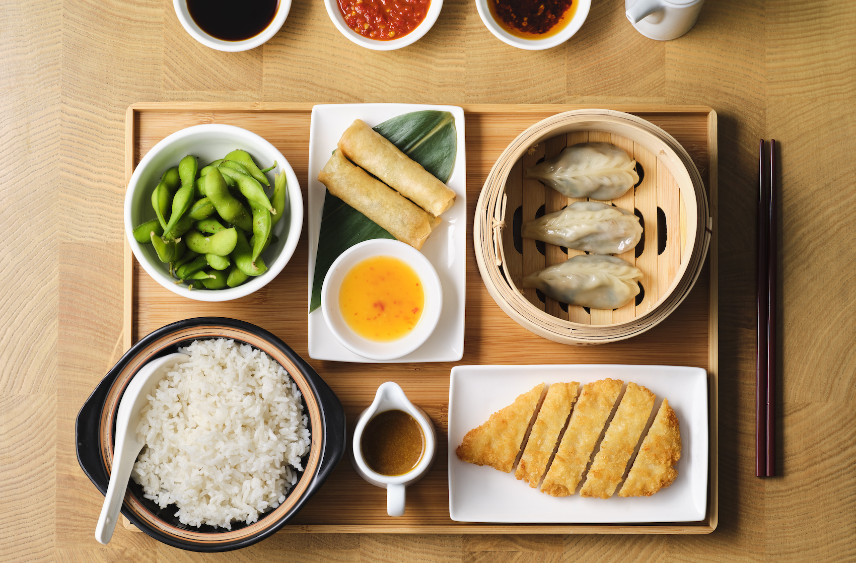 Your Bento Box comes with a base serve of steamed jasmine rice, a bowl of edamame, and two vegetable spring rolls.
