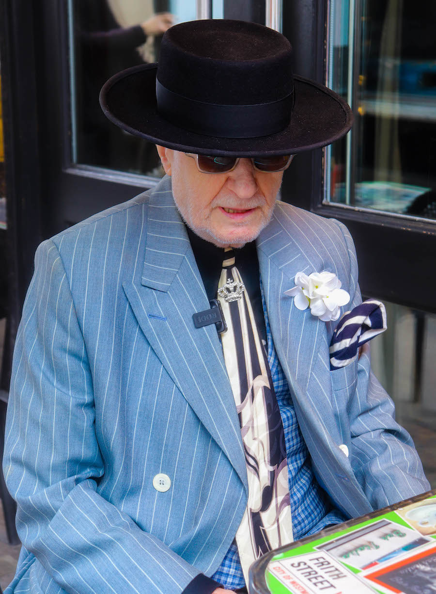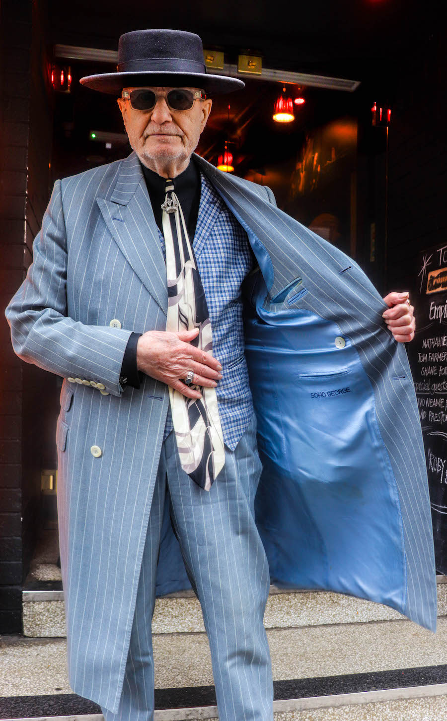George has long been heralded a Soho icon and has strutted the streets since 1956, standing out for his unique fashion and demeanour. Today, George emerges from the corner of Firth Street, a vision of sophistication and style. He is sporting a bespoke grey and white suit, black bolero hat, and purple-tinted sunglasses. He is the epitome of elegance, standing out amidst the sea of casually dressed passers-by.