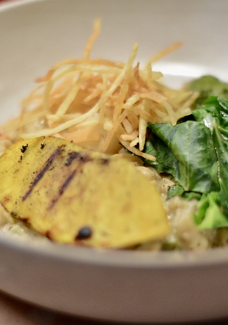 Akara, a traditional Nigerian deep-fried bean cake, is featured on the set lunch menu as a starter. It was crisp on the outside and light and sponge-like on the inside to help mop up the delightful bright orange-hue sauce it came with. I enjoyed the subtle distinct flavour note of palm oil I associate with both akara and the Brazilian version, acarajé. I also liked the chunks of sweated-down chopped onions, an ingredient that plays a key part in West African household cooking. The second starter was a fermented rice cake. Fermented starches, particularly from corn and root vegetables, hold significant importance in West African cuisine (evident in dishes like Ghanaian kenkey). This rice cake served as a subtle yet palatable nod. Sitting proudly on top was a concoction reminiscent of what I can only describe as ‘Heinz vegetable salad’ (I haven’t seen them around for a minute, wow!) It evoked nostalgic memories of this all-so-familiar item. Back in the day in Ghana, referring to “salad” would conjure the image of a tin of Heinz Vegetable Salad, thanks to British influence and the influx of canned goods during colonial times. I shared this observation with Dad, which made him laugh, and recall that salad was pretty much Heinz vegetable salad mixed with other ingredients, like potatoes, eggs and mayonnaise, rather than a salad leaf, during his upbringing in Ghana. *insert emoji shocked face*