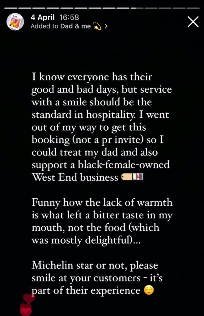 This lingering heaviness persisted when I got home, overshadowing the overall positives of my lunch with Dad. I took to my IG Stories (my safe space) and shared a generalised opinion about the day’s lunch. While my platform is dedicated to highlighting positive experiences, I remain true to myself by providing honest assessments. I humoured my dad being on time (hallelujah) and it being me being tardy thanks to walking with crutches and a boot. I jokingly (well, kinda actually serious) claimed the jollof rice as Ghanaian (an ongoing, mostly light-hearted jollof rivalry between Ghanaians and Nigerians). I also mentioned finding the service to be cold, without specifying names or tagging the restaurant visibly, strategically avoiding appearing to discredit anyone. This was in no way ‘bashing’, especially as I didn’t mention the venue.