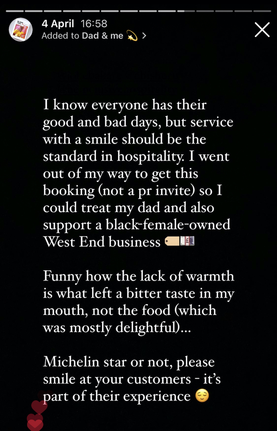 This lingering heaviness persisted when I got home, overshadowing the overall positives of my lunch with Dad. I took to my IG Stories (my safe space) and shared a generalised opinion about the day’s lunch. While my platform is dedicated to highlighting positive experiences, I remain true to myself by providing honest assessments. I humoured my dad being on time (hallelujah) and it being me being tardy thanks to walking with crutches and a boot. I jokingly (well, kinda actually serious) claimed the jollof rice as Ghanaian (an ongoing, mostly light-hearted jollof rivalry between Ghanaians and Nigerians). I also mentioned finding the service to be cold, without specifying names or tagging the restaurant visibly, strategically avoiding appearing to discredit anyone. This was in no way ‘bashing’, especially as I didn’t mention the venue.