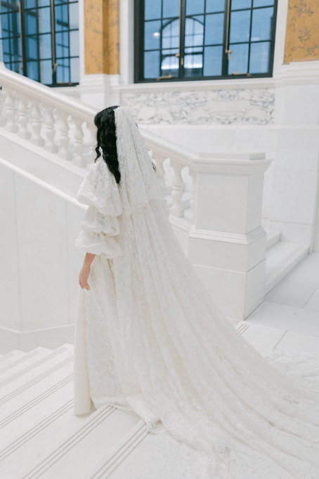 Featuring a stunning long train, this veil is made using a dense lace and looks incredible worn over a simple dress to add texture to a look. Wear it over the face or tiered down the back.