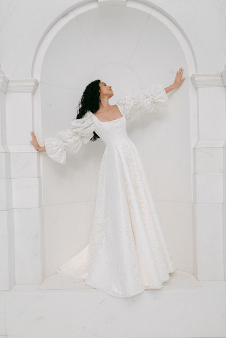 These triple-bubble, silk organza statement sleeves can be chosen with or without an overlay of delicate floral lace. The organza material ensures that they maintain their volume and can be styled either to the wrist or ruched on the arm, depending on personal preference. These detachable sleeves are securely fastened to either the Dominique dress or the Victoria dress using concealed poppers.