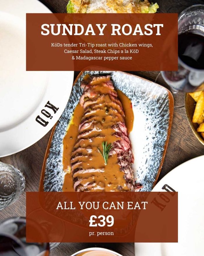 Every sunday you can enjoy KöDs tender tri-tip roast and chicken wings with side orders: Steak Chips à la KöD, seasonal salad & Madagascar pepper sauce. The menu is “all you can eat” – you will not go home hungry!